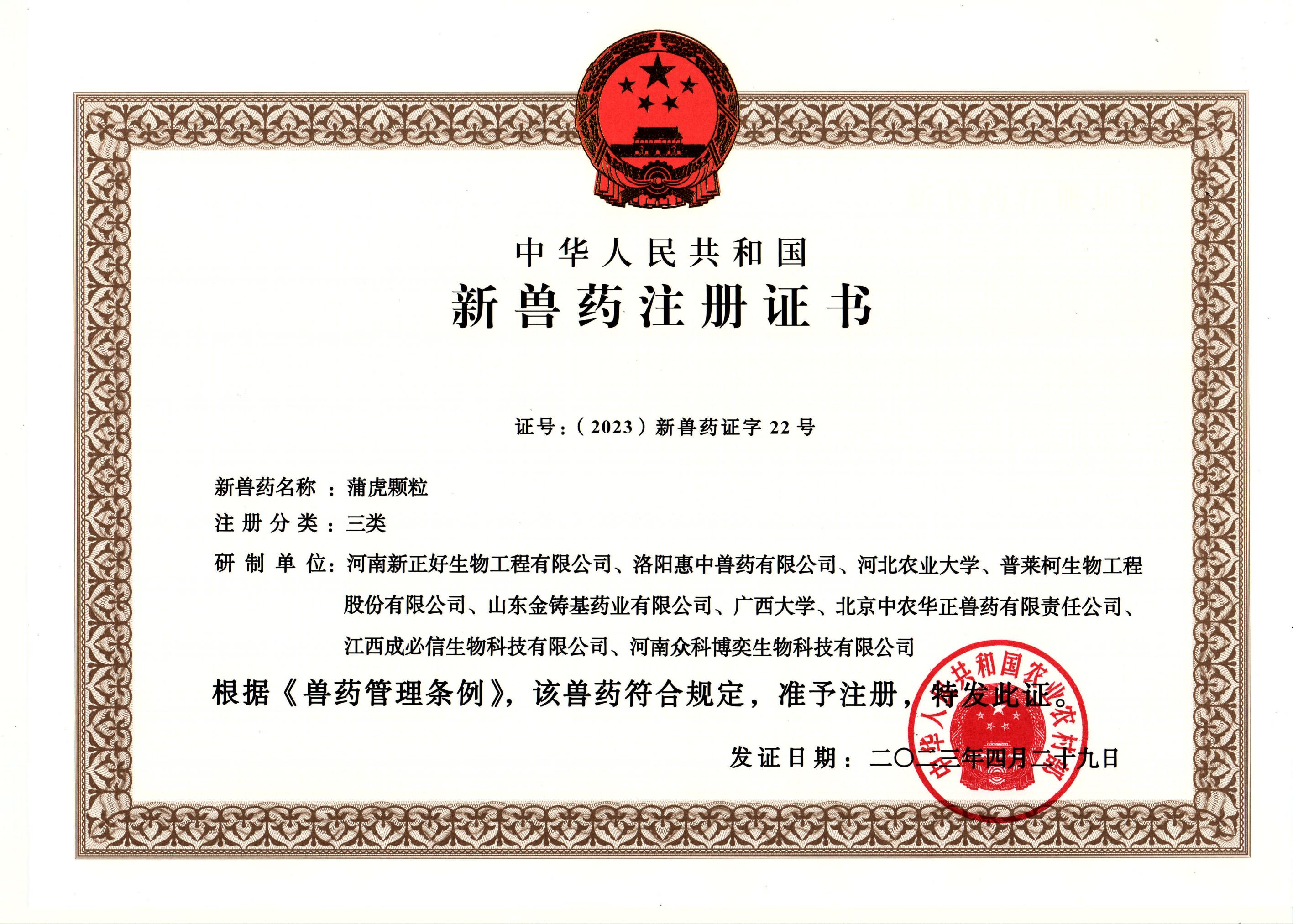 根據《獸藥管理條例》和《獸藥注冊辦法》規定,經農業農村部審查,批準洛陽惠中獸藥有限公司參與申報的“蒲虎顆粒”為國家三類新獸藥。公司于近期收到新獸藥證書。