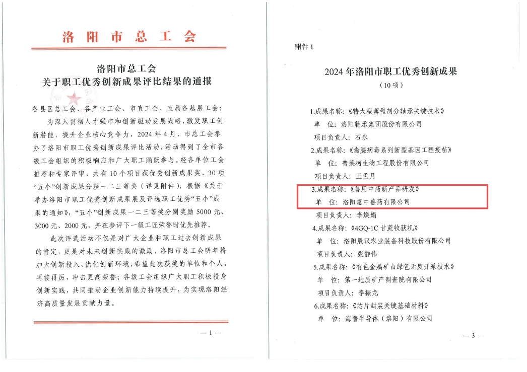 近日,通過洛陽市總工會評選,由惠中獸藥李煥娟帶領公司研發團隊開展的獸用中藥新產品研發項目成果,獲得“2024年洛陽市職工優秀成果獎”。